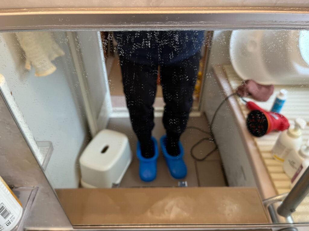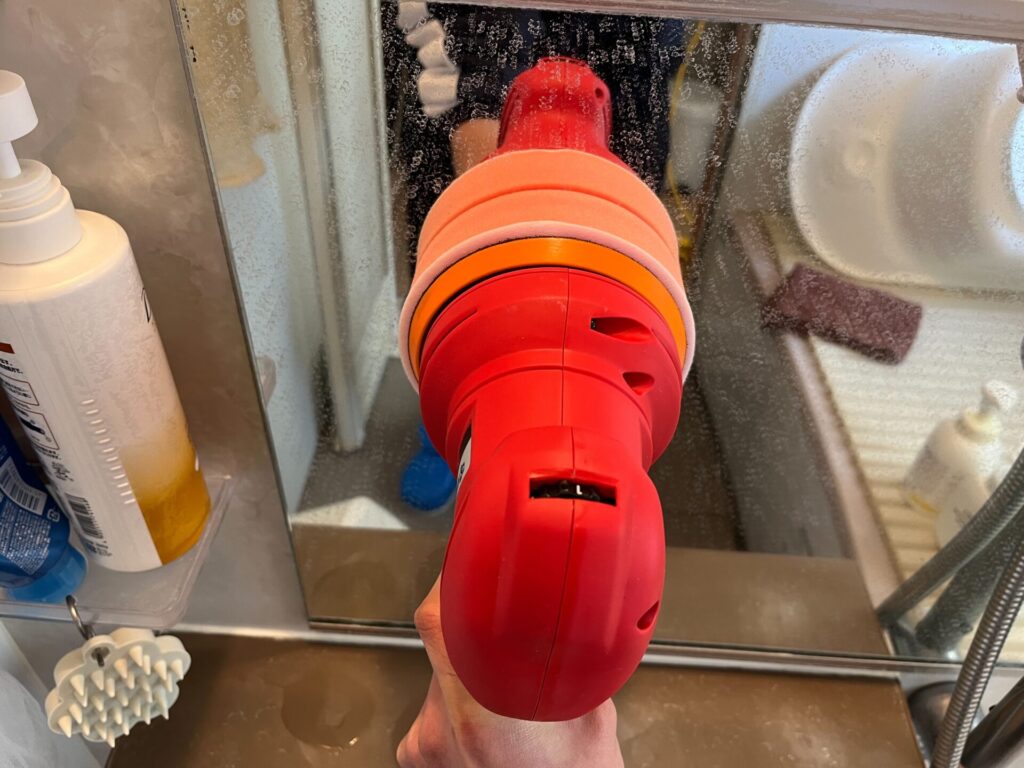 ポリッシャー+コンパウンドでお風呂の鏡のうろこ取りに挑戦しました。完全には取り切れませんでしたが、効果が全くなかったわけではありません。