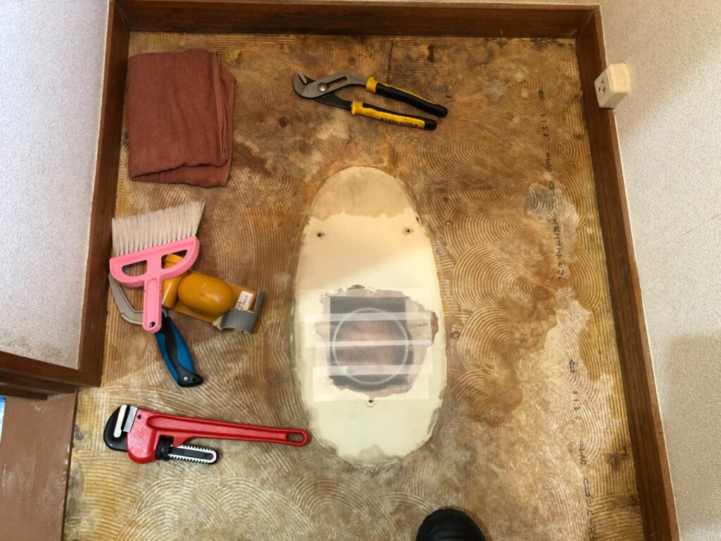 ⚠️ 便器を外したら排水管に必ず蓋をしてください。タオルを詰めるかテープで塞いでおきます。異物が落ちると二度と取れないと考えた方が良いです。