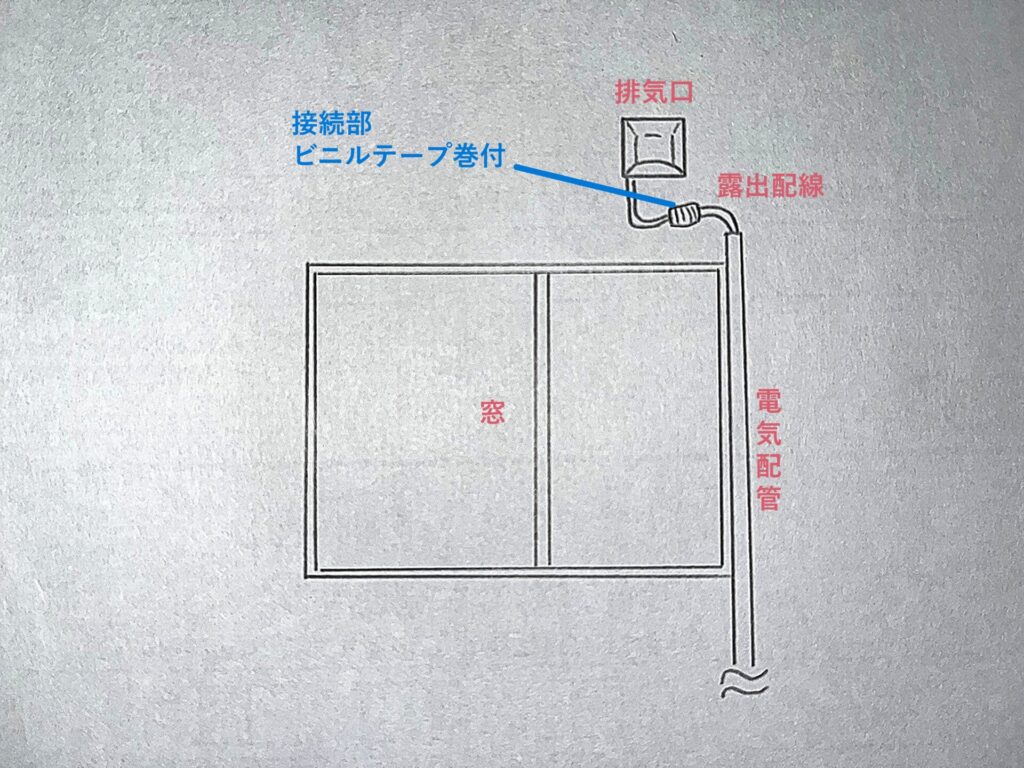 取り外してみて気になったことがありました。既存の換気扇の電源が、室内から配管パイプを通って外壁側で電線が接続されている状態でした。(写真撮り忘れてしまったので手書きです🙏)