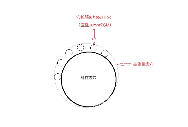 新しい換気扇のダクト径に合わせて、内壁の穴をドリルと刃先の細いノコギリで拡張します。